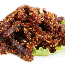 黔江地處武陵山腹地,生態環境優越,自然草場資源豐富。蓬江牌牛肉干選用武陵山天然草場資源放養的優質黃牛,經嚴格的宰前宰后檢疫,精選其后腿精瘦肉為原料,利用傳統配方,采用傳統工藝和現代科技精制而成,該產品片薄均勻剔透、呈玫瑰色澤、咸甜適宜、酥軟可口、回味悠長、風味獨特,食用方便、綠色、健康。