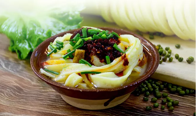 綠豆性涼味甘,有清熱解毒、止渴消暑、利尿潤膚的功效。濯水綠豆粉用大米和綠豆為主要原料磨成漿,再用漏斗將其均勻地流到熱鍋上燙成絲狀或塊狀,極具口感。